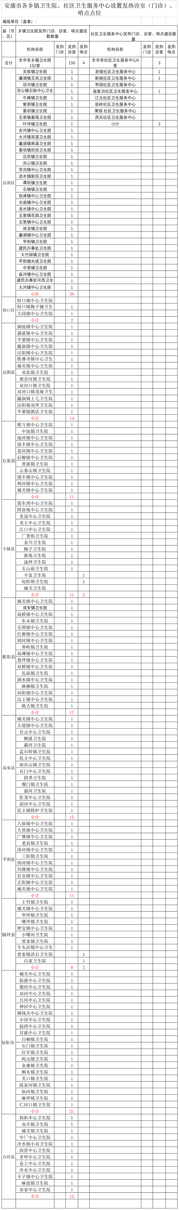 安康市各鄉(xiāng)鎮(zhèn)衛(wèi)生院、社區(qū)衛(wèi)生服務(wù)中心設(shè)置發(fā)熱診室(門(mén)診)、哨點(diǎn)點(diǎn)位