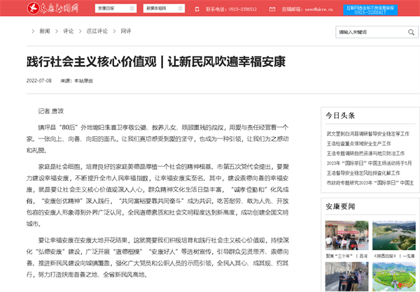安康新聞網(wǎng)大力宣傳和踐行社會主義核心價值觀,大力宣傳中國夢,全媒體開設(shè)“社會主義核心價值觀”“新時代 新經(jīng)典”“我們的中國夢 文化進萬家”等專欄,刊出《黨員干部要帶頭踐行核心價值觀》《讓新民風(fēng)吹遍幸福安康》《漢濱區(qū)市場監(jiān)管局:用心培育“文明花”》等一批重點稿件,正黨風(fēng)、淳民風(fēng)、興家風(fēng)、樹新風(fēng),宣傳人民群眾為實現(xiàn)中國夢而奮勇拼搏的事跡,讓社會主義核心價值觀深入人心。