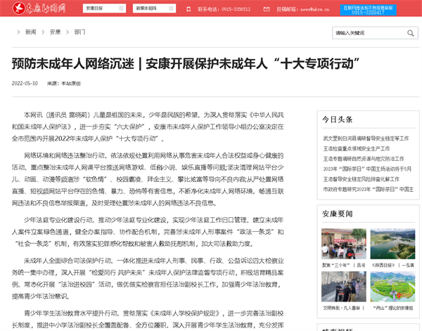 關(guān)注民生熱點,彰顯為民情懷。積極做好民生政策類宣傳報道,圍繞教育、醫(yī)療、就業(yè)、食品安全、養(yǎng)老等民生熱點,注重反映少數(shù)民族、婦女、兒童、老年人、殘疾人等意見呼聲,刊發(fā)了《預(yù)防未成年人網(wǎng)絡(luò)沉迷 | 安康開展保護未成年人“十大專項行動”》《民族團結(jié)之花常開長盛》《寧陜:為癱瘓老人上門辦證 譜寫警民暖心故事》等報道。