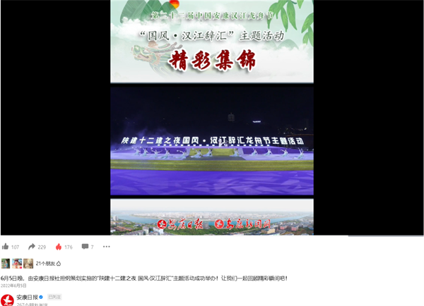 深化融合創(chuàng)新,全力打造高附加值文化創(chuàng)意產(chǎn)品。2022年第二十二屆中國安康漢江龍舟節(jié)期間,由安康日報社統(tǒng)籌承辦“國風(fēng)·漢江辭匯”主題公益演出活動,安康新聞網(wǎng)全力配合,落實晚會執(zhí)行、線上直播、采風(fēng)活動全程宣傳,“國風(fēng)·漢江辭匯”演出全網(wǎng)現(xiàn)場直播,點擊量達到100W+。活動還引發(fā)全網(wǎng)多家媒體爭相報道。截至目前,包括人民日報、中央廣播電視總臺《藝術(shù)傳承》官網(wǎng)、今日頭條、北京在線、山東熱線等70余家中省市媒體單位陸續(xù)轉(zhuǎn)載報道。