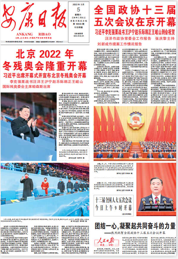 (2022年3月5日安康日報01版“北京2022年冬殘奧會隆重開幕”、“全國政協(xié)十三屆五次會議在京開幕”)