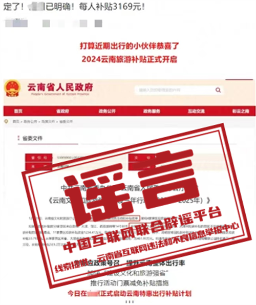 謠言:去云南旅游每人補(bǔ)貼3169元?