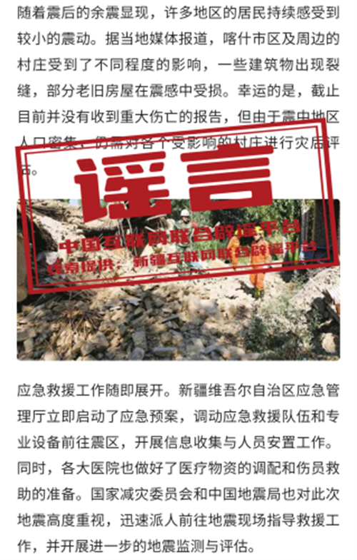 真相:近日,有網(wǎng)民發(fā)布帖文稱“新疆喀什市7月22日發(fā)生6.3級地震,周邊村莊建筑出現(xiàn)裂痕,部分老舊房屋在震感中受損……”。經(jīng)新疆喀什市應急管理局證實,當日喀什市域內(nèi)未發(fā)生地震,中國地震臺網(wǎng)也未發(fā)布喀什當日發(fā)生地震的相關信息,此信息為虛假內(nèi)容。(來源:網(wǎng)信新疆、新疆喀什網(wǎng)絡舉報)