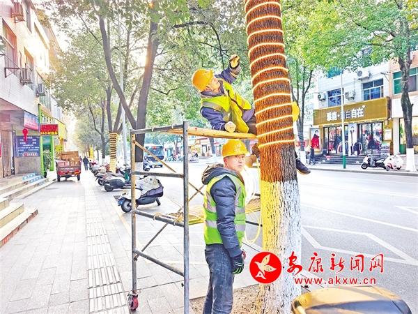 石泉縣為營造絢麗多彩的城市夜景,在向陽大道兩旁的景觀樹上安裝LED燈帶。楊勇 攝
