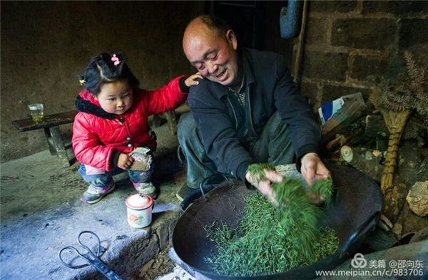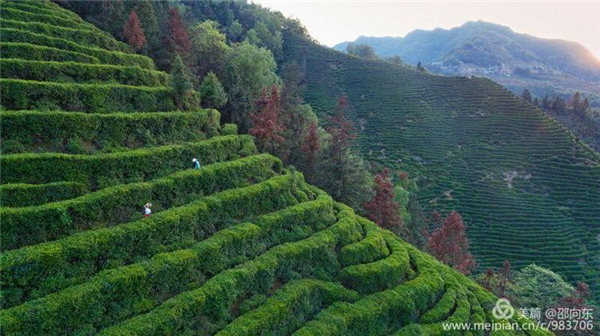 如今的紫陽,江還是那條江,梁還是那道梁,茶卻是越來越精致香純了,每到三月嫩芽初發(fā),江霧從水面慢慢升騰,毛茸茸的芽尖頂著露珠在晨光中閃耀,竹林掩映著白墻黛瓦,一縷炊煙合著柴雞的打鳴懶散飄過,采茶的姑娘腰系小竹簍,三五結伴在茶山穿行,人未見聲先來,嫩綠的樹林間搖擺著水蛇腰,老人說那是好山好水、好茶好飯養(yǎng)出的西妹兒。