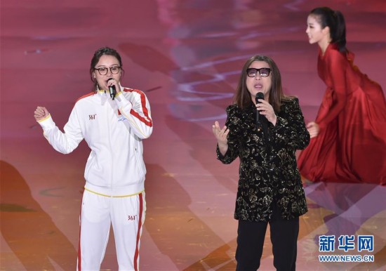 9月8日,游泳運動員傅園慧(左)和歌手郭峰在閉幕式上演唱。 當(dāng)日,第十三屆全運會在天津閉幕。 新華社記者岳月偉攝