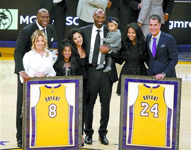 在珍妮發(fā)言結(jié)束后,在球館上空退役球衣墻上,8號(hào)與24號(hào)球衣緩緩展開,與另外9件退役戰(zhàn)袍高懸于斯臺(tái)普斯中心的上空。兩個(gè)號(hào)碼與20年的職業(yè)生涯,就此在“紫金軍”歷史中封存,成為閃耀著光輝的豐碑。雙球衣號(hào)碼退役,是湖人給予科比的終極榮譽(yù)。在NBA歷史中,科比是第一位獲得兩個(gè)球衣號(hào)碼同時(shí)退役殊榮的球員。