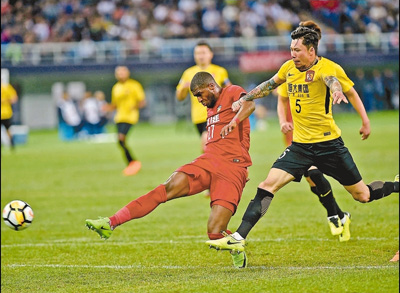 | 5月8日,天津權(quán)健隊球員莫德斯特(左一)在比賽中射門。 |