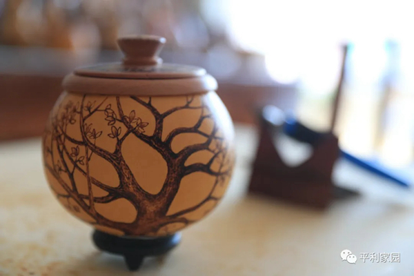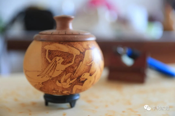 一組葫蘆,一組小物件。上面的畫,全是腦海中的圖案,烙筆一拿,眼睛一閉,線條在流淌,輕勾細挑,提捺頓按,全是走的心靈深處的路徑。
