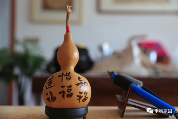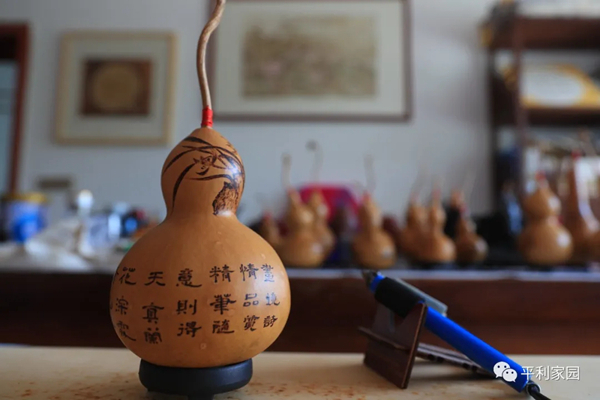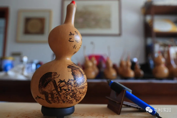 一組葫蘆,明黃里透出古色,熠熠生輝的畫幅里,平利雄山秀水滴滴溢出,一時間,香氣四溢,鄉(xiāng)風彌漫,整個房間便裝滿女媧故里平利的山山壑壑。