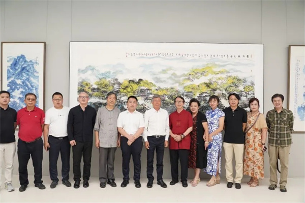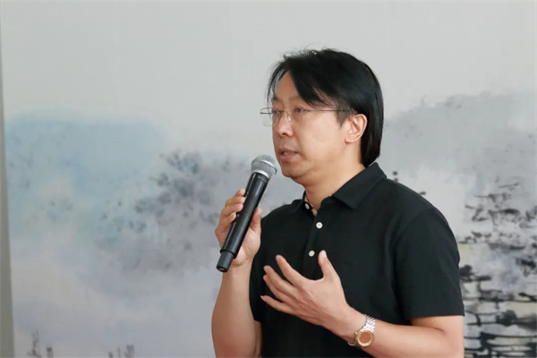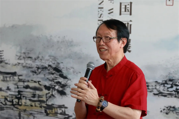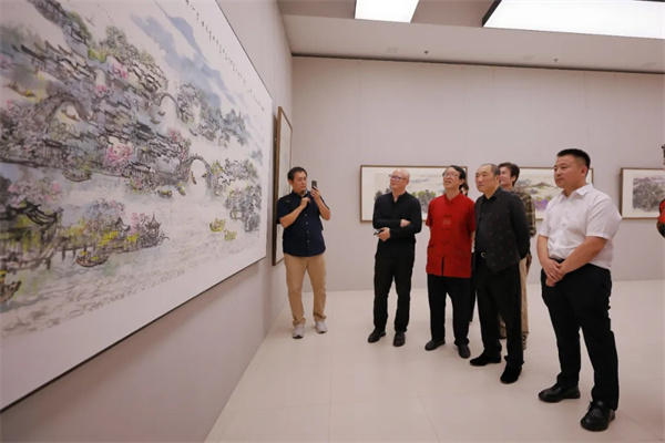 于洋在致辭中表示,“王福元先生的作品之所以被觀者所認同,被畫壇所稱道,正是源于他對藝術(shù)的執(zhí)著態(tài)度,及其作品顯現(xiàn)出的鮮明藝術(shù)特色和濃郁的個人風格。其作品的個人特色主要體現(xiàn)在三個方面:其一,王福元先生長于色彩,并獨創(chuàng)‘幻彩’畫法。他不囿于傳統(tǒng)山水畫色彩的固有程式,其作品色彩鮮活、生動清透,筆下的江南山水玲瓏剔透、氤氳朦朧,同時色彩絢爛,極具觀賞性,作品色彩張力和視覺沖擊力強;其二,王福元先生的山水畫具有綜合跨界性,借鑒了繪畫領(lǐng)域外其他藝術(shù)門類的風格。王福元先生長于音律,能演奏笛、蕭等樂器,因此他的山水畫有以音律入畫、注重意蘊表達的特點,具有很強的節(jié)奏感和律動感。其三,他的山水畫具有很強的筆墨、色彩、圖式的個人特點。與北方山水不同,江南山水因其獨特的地域性,具有一派平遠的景象。他把個人思考和表現(xiàn)風格化育在清透的江南文人水鄉(xiāng)氣象之中,在承續(xù)傳統(tǒng)文脈的同時也顯現(xiàn)了地域文化性格,這是十分可貴的。正因為這三個方面的特點,我覺得王福元先生筆下的江南山水既是南派山水畫自古以來變遷中的一種發(fā)展,也是他通過自身的綜合思考和知行合一的積淀所衍生出來的個人風格。”。